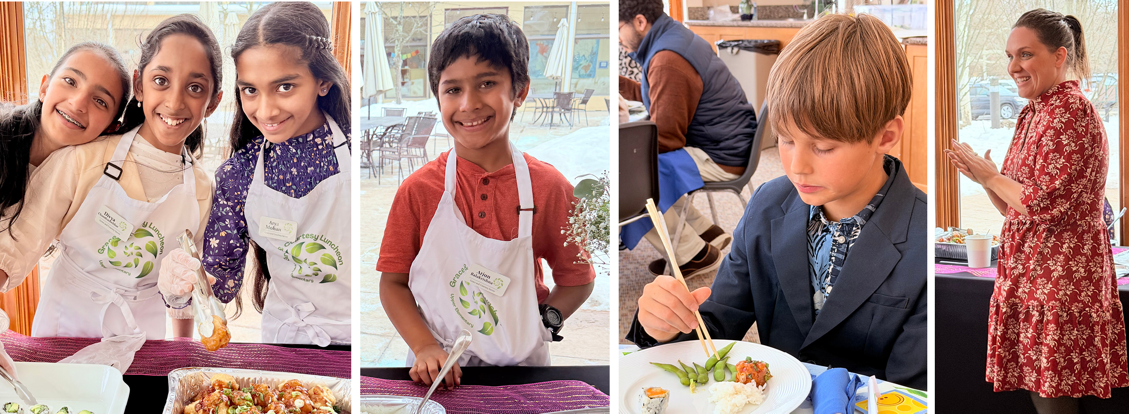 Because we were serving Japanese food at the luncheon, Upper Elementary students practiced using chopsticks earlier in the week.
