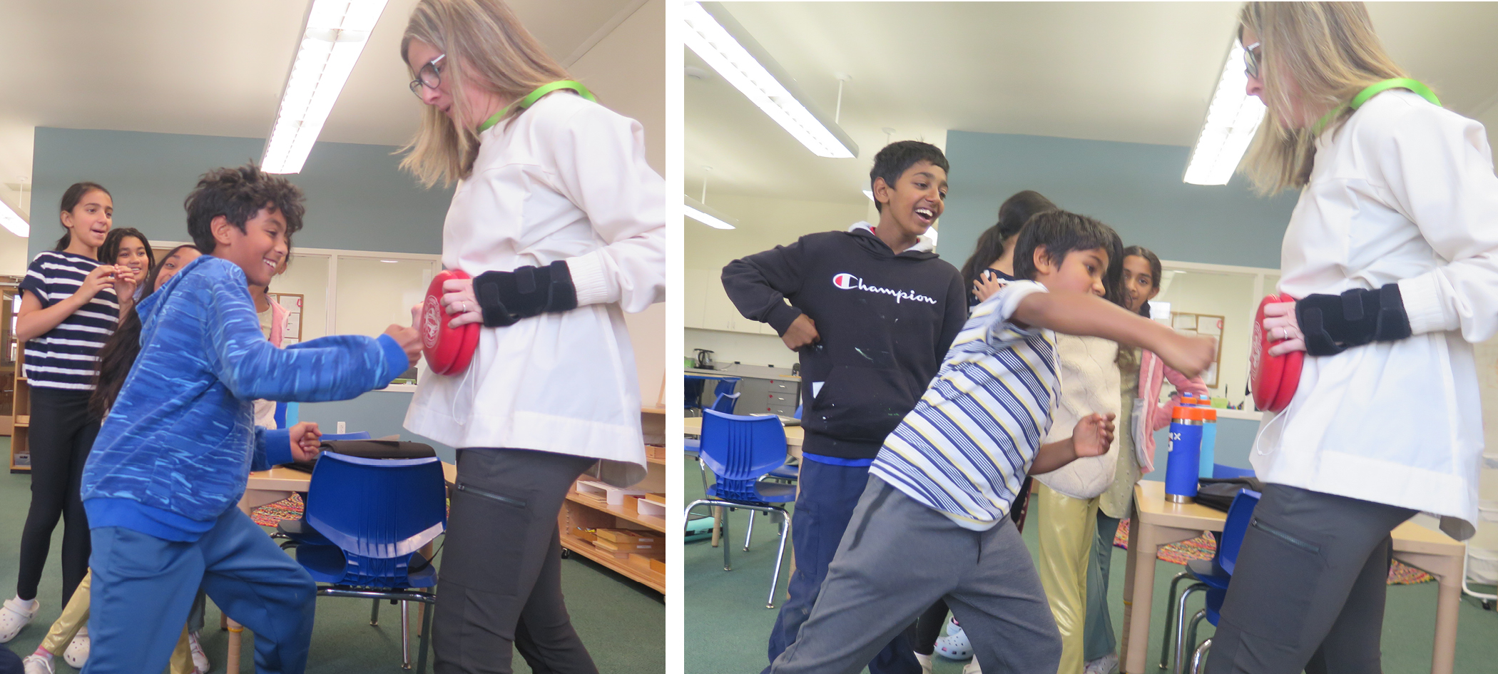 Throughout the week, Fifth Grade studied Isaac Newton’s three laws of motion in Physical Science. On Tuesday and Wednesday, the Fifth graders learned and did experiments on forces that act upon an object at rest, a sliding object, a floating object, a hanging object, and a falling object. One of these experiments included Mrs. Lobo teaching us how to do a Taekwondo punch and feel the reaction force. We also got to hold the target that we used to punch and watch how strong her punches were.