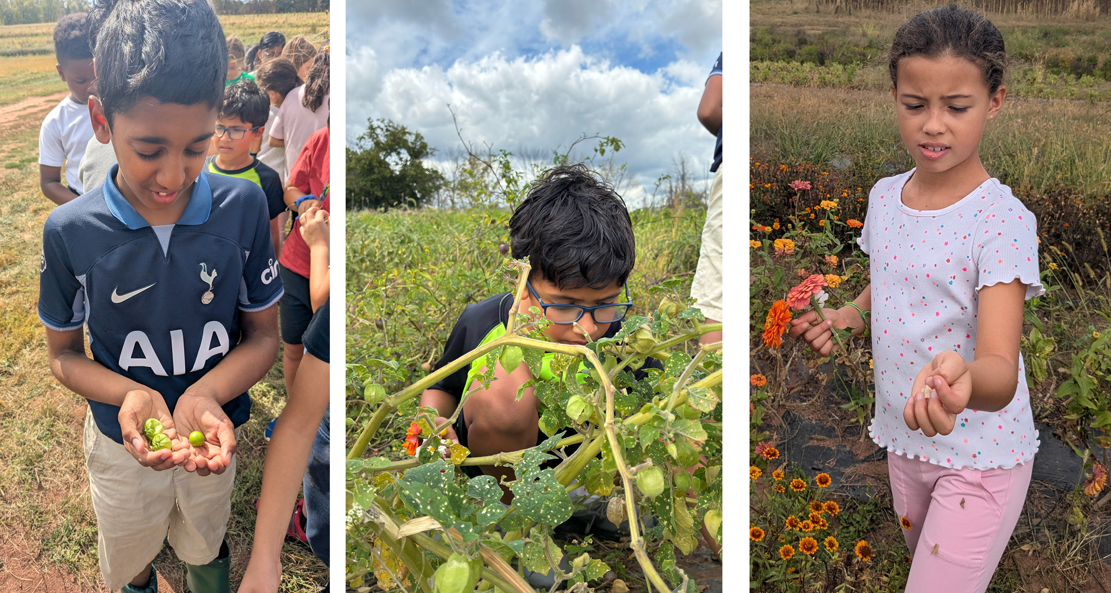 Upper Elementary students harvested flowers and tomatillos. Tomatillos are members of the tomato family and are used to make Salsa Verde.